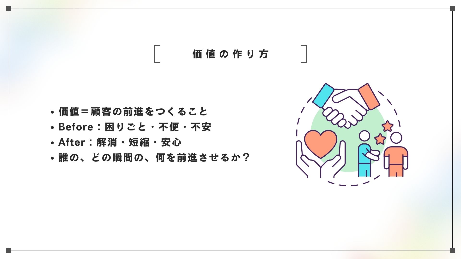 このように、価値とは「誰の、どの瞬間の、何を前進させるか」を明確に言葉で説明できるものです。