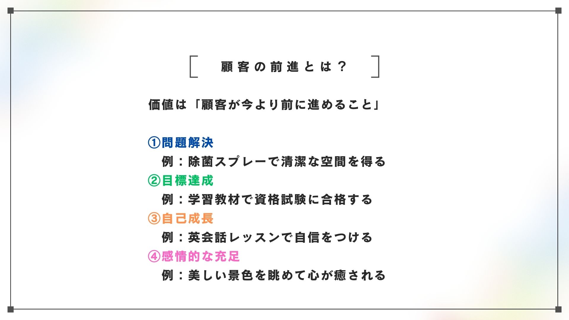 この記事では、価値を 「顧客の前進をつくること」 と定義します。