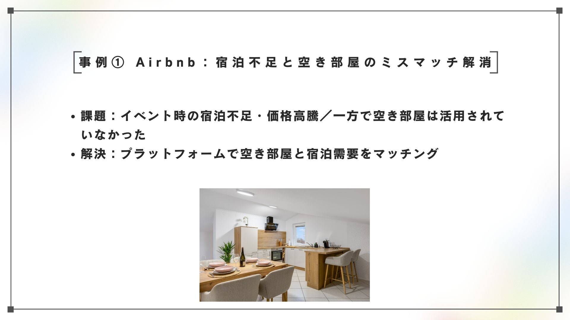- Airbnbは「宿泊先が見つからない」という課題を解決し、旅行体験を前進させました。