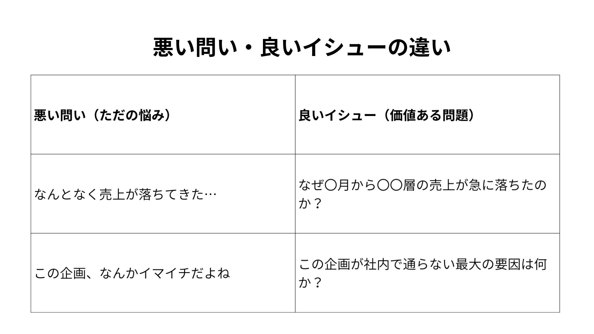 一方、「なぜ〇月から〇〇層の売上が落ちたのか?」という問いは、原因を特定し、打ち手に結びつけられる具体的な“イシュー”になっています。