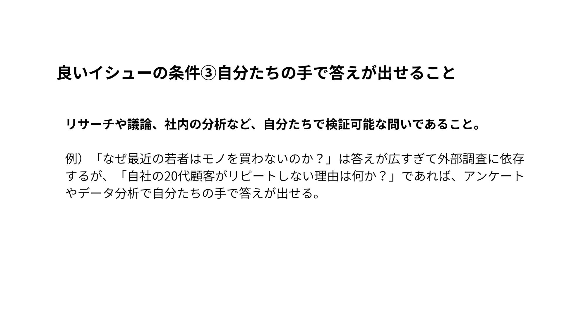 例)「なぜ最近の若者はモノを買わないのか?」は答えが広すぎて外部調査に依存しますが、「自社の20代顧客がリピートしない理由は何か?」であれば、アンケートやデータ分析で自分たちの手で答えが出せます。