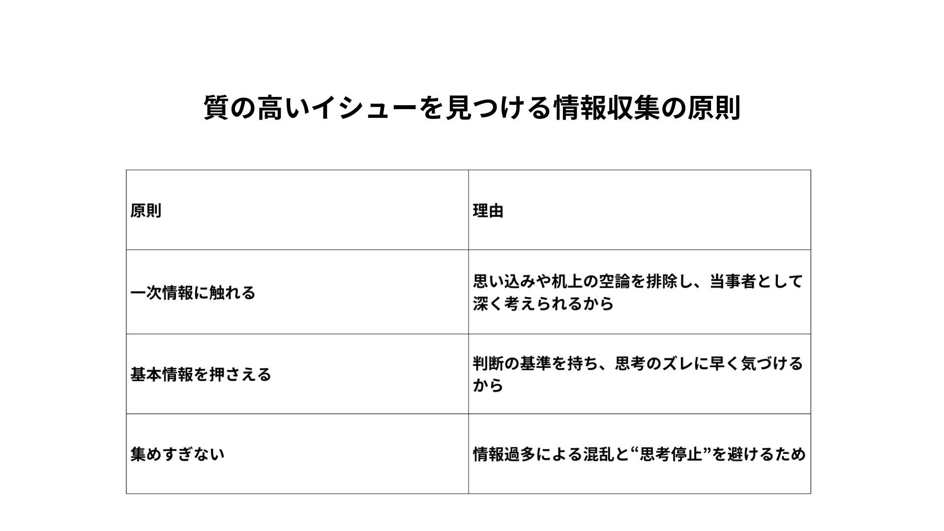 ここでは、質の高いイシューを立てるための3つの情報収集の原則と、それがなぜ大切なのかを詳しく解説します。
