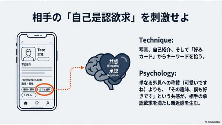 内面を重視するアプリでは、単に「可愛いですね」と褒めるよりも、「その趣味、僕も好きです!」と伝える方が、相手の承認欲求が満たされ、親近感を持ってもらいやすくなる。