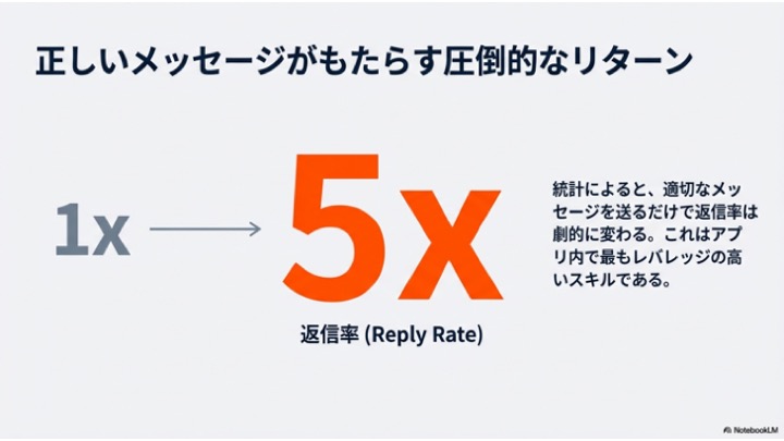 統計によれば、適切なメッセージを送ることで、返信率は最大で5倍も変わると言われている。