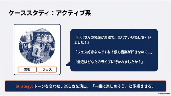 - プロフィールへの言及 相手の写真や自己紹介、「好みカード」などのキーワードに触れる。「写真だけでなく内面を見ている」という特別感を演出するためである。