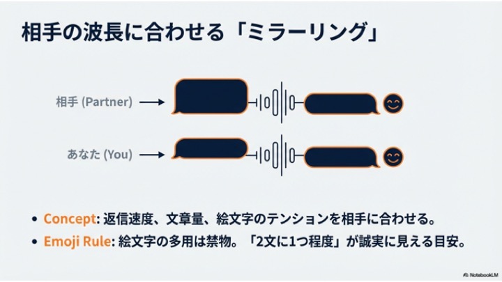 理想はマッチング直後、遅くとも24時間以内に一通目を送る。時間が経つほど熱量は下がる。 - 「ミラーリング」を活用する