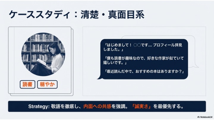 敬語を徹底し、内面への共感を強調。「誠実な人だ」という安心感を与える。