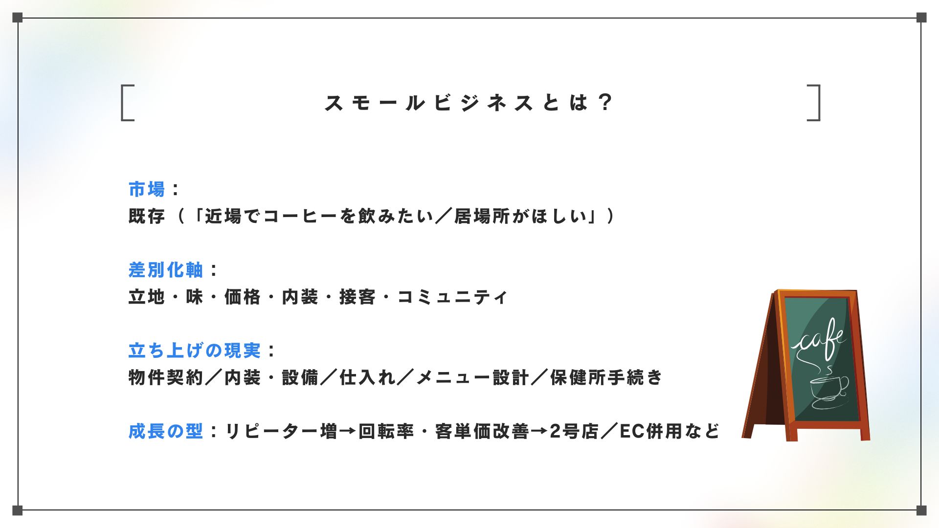 まず市場。スモールビジネスはすでにある需要を狙います。たとえば街のカフェ、美容室、学習塾のように、みんながすでに利用しているサービスです。