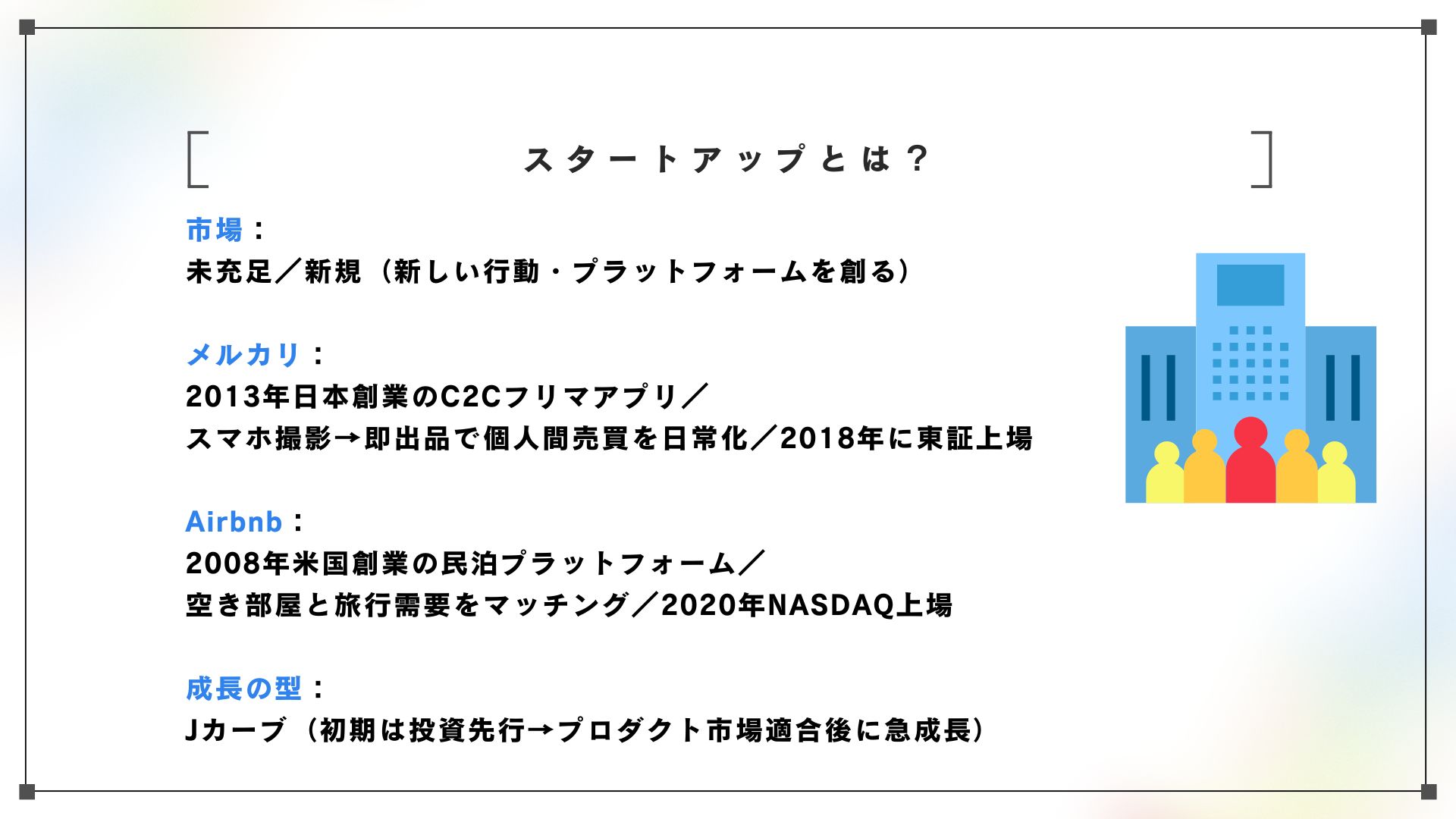代表的な例としては、フリマアプリのメルカリや、民泊サービスを世界に広めたAirbnbが挙げられます。彼らはスケール、つまり規模拡大を最初から強く意識して事業をつくっているのが特徴です。