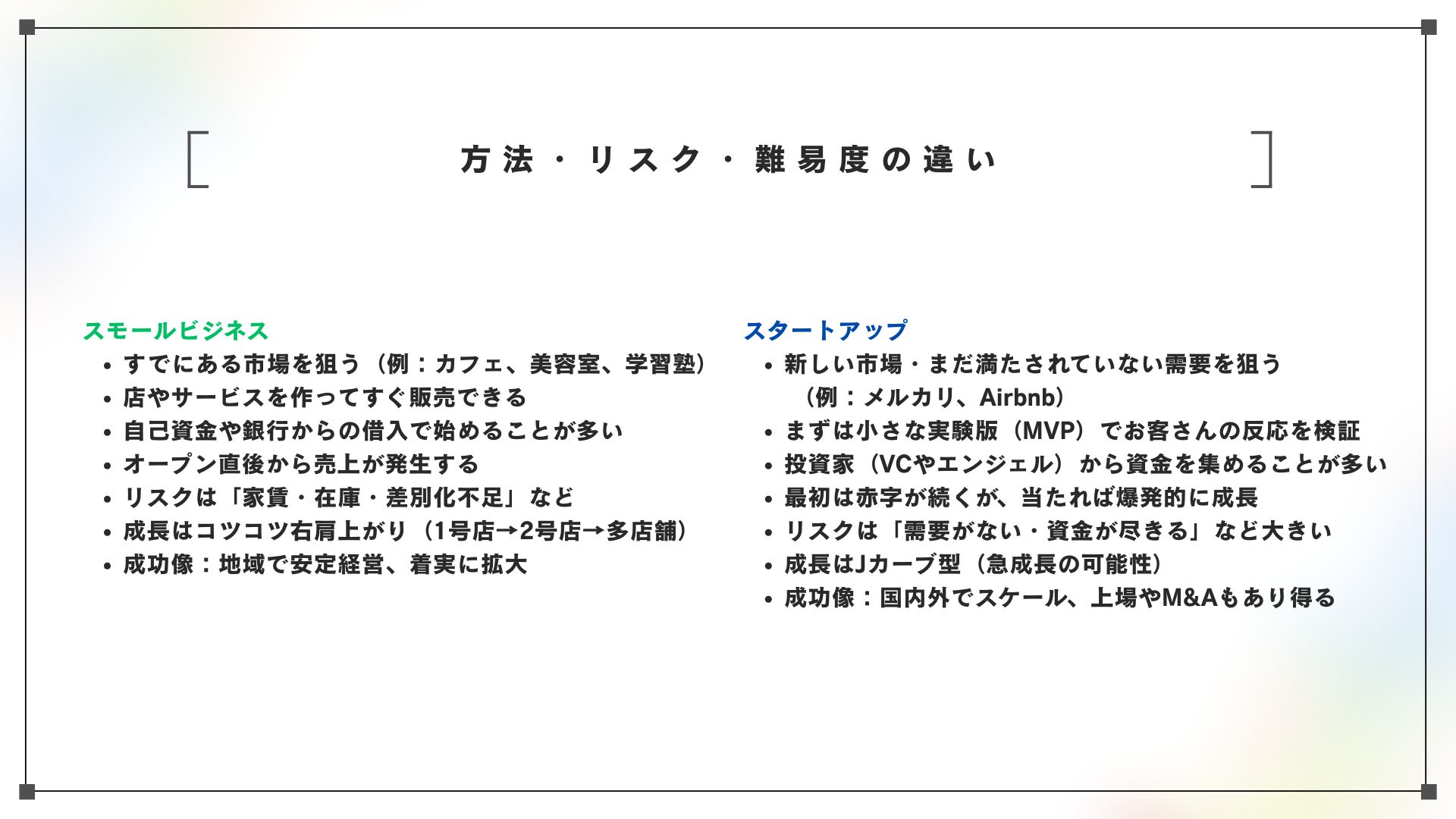 最後に成長のイメージ。スモールビジネスはコツコツ積み上げ、1号店が安定したら2号店、というように着実に広げます。スタートアップは、最初は赤字でも、当たりを見つけると一気に伸びる“Jカーブ”を描きます。