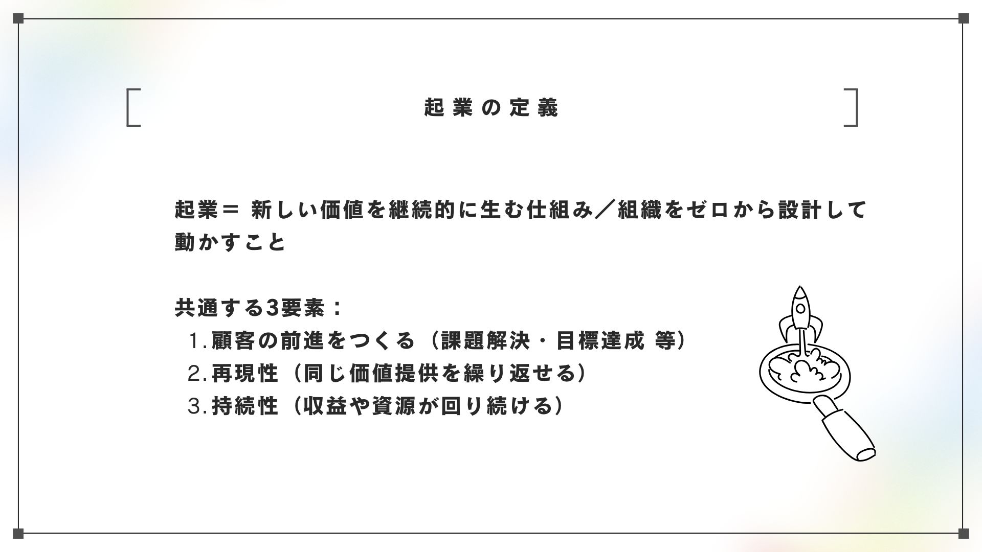 起業とは、新しい価値を、再現可能かつ持続可能な形で提供する仕組みをつくること。